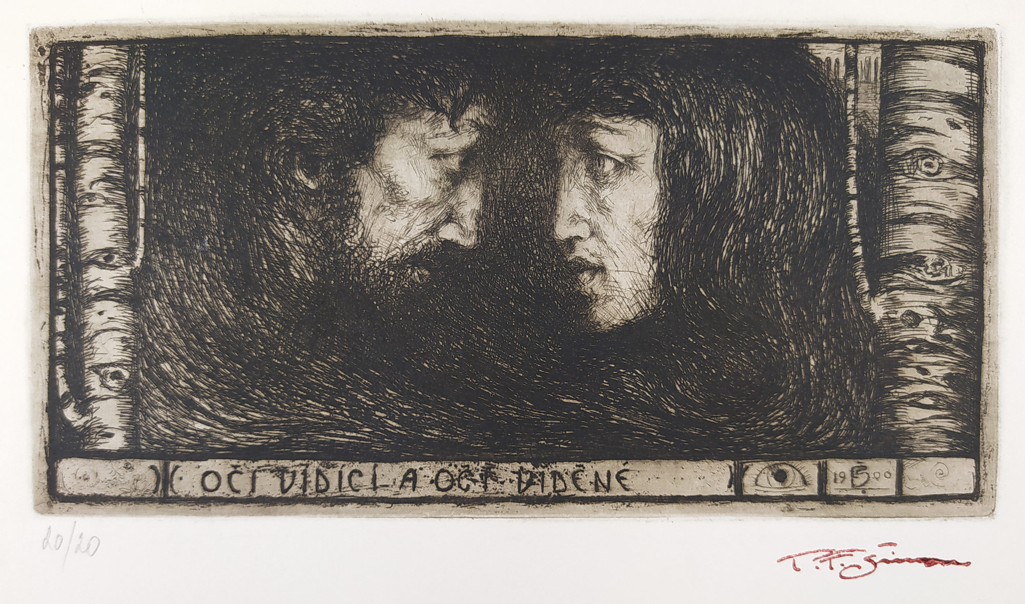 Šimon Tavík František – Oči vidící a oči viděné, lept (1900), novotisk č. 20/20, nedatováno. Signatura: novotisk v nákladu 20 exemplářů označeno razítkem vpravo dole T. F. Šimon. Celkový rozměr: 18,0 cm × 31,1 cm.