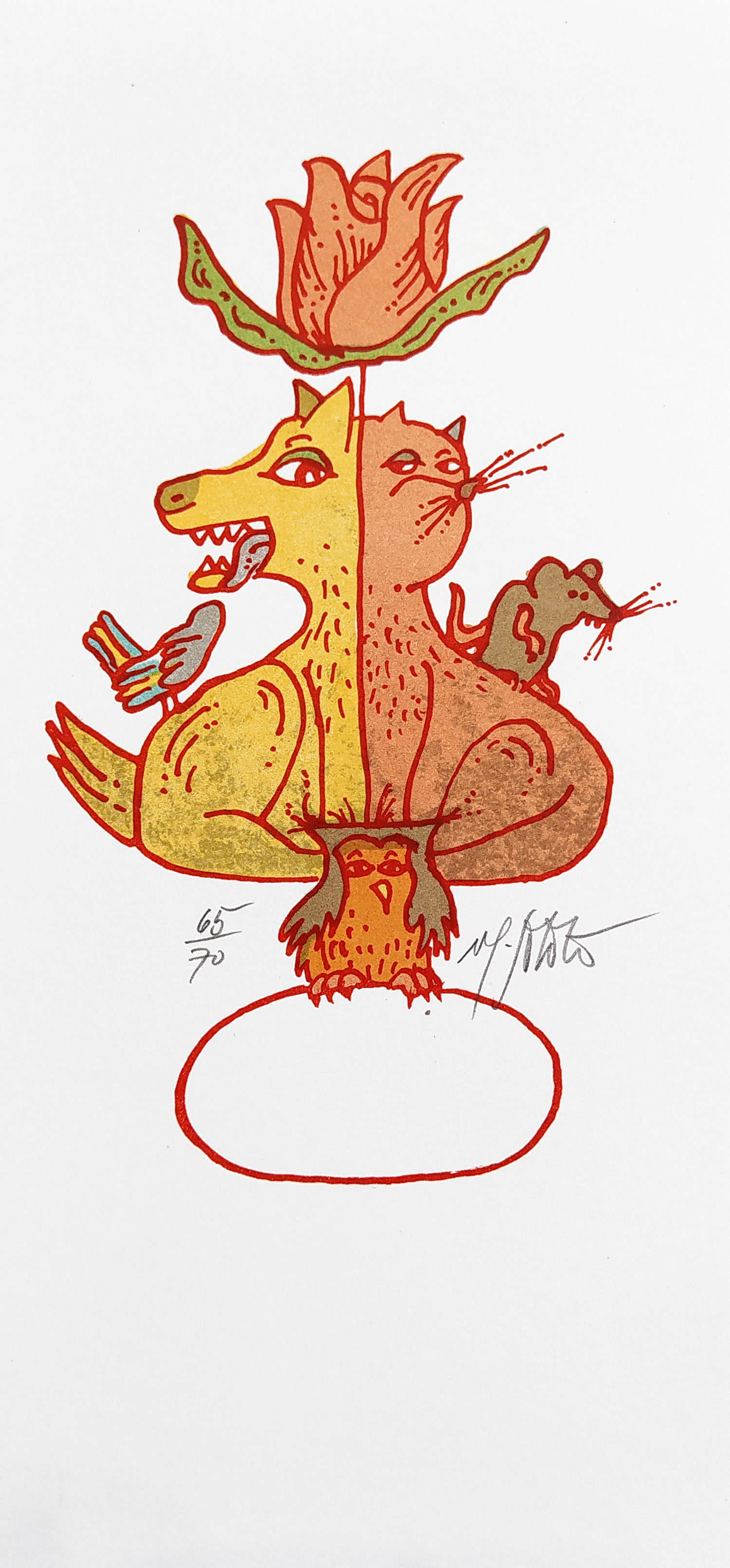 Vlastimil Sobota – Kočkopes, barevná litografie, číslováno 65/70, nedatováno. Signováno tužkou vpravo dole. Celkový rozměr: 21,0 cm × 9,9 cm.
