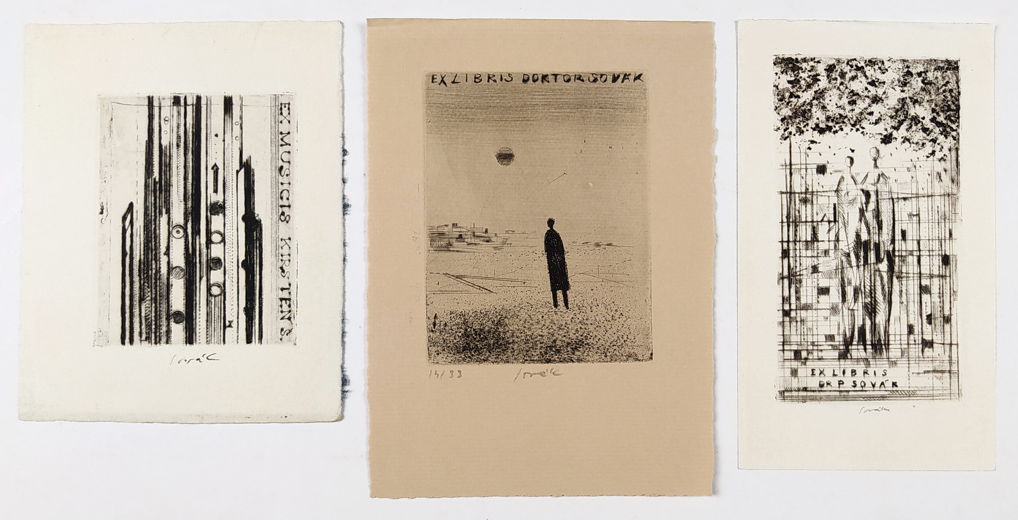Sovák Pravoslav – Tři Ex libris, původní suché jehly, nedatováno. A/ Ex libris Doktor Sovák r. 1965, B/ Ex libris S. Kirsten r. 1962, C/ Ex libris Dr. P. Sovák r. 1963. Signováno tužkou uprostřed dole. Celkový rozměr: A/ 14,6 cm × 10,4 cm B/ 12,2 cm × 9,6 cm C/ 13,8 cm × 7,8 cm.