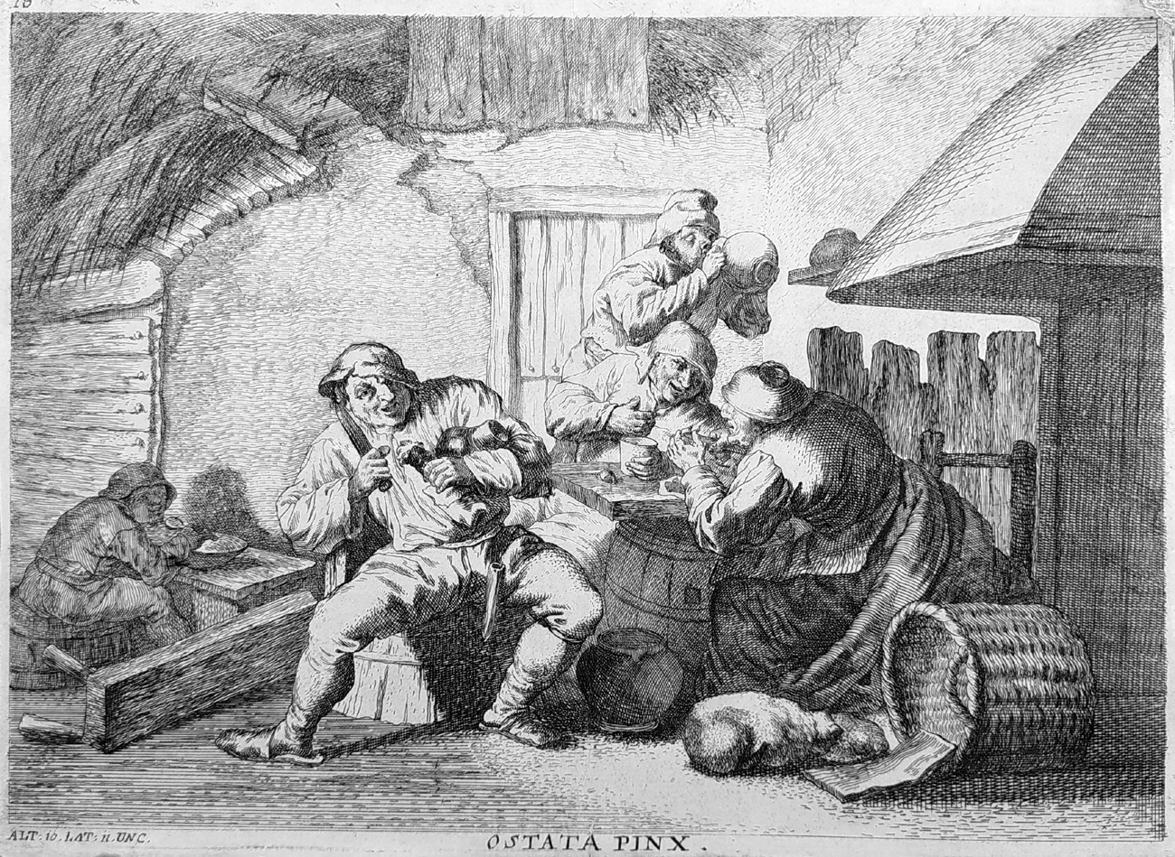 Prenner Anton Joseph von – Sedláci pijící u stolu, původní lept, 1728. Razítko na rubu: J. V. Karásek Praha, tužkou č. 284. Celkový rozměr: 16,5 cm × 22,7 cm.