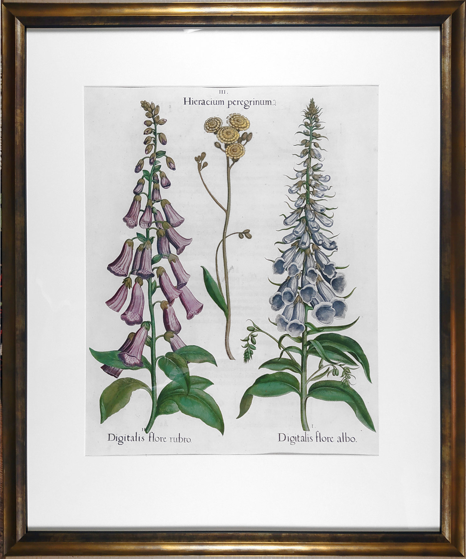 „I. Digitalis flore albo – Náprstník bílý, II. Digitalis flore rublo – Náprstník červený, III. Hieracium peregrinum – Jestřábník“. Staře kolorovaný původní mědiryt z B. Beslerova (1561–1629) slavného díla Hortus Eystettensis.