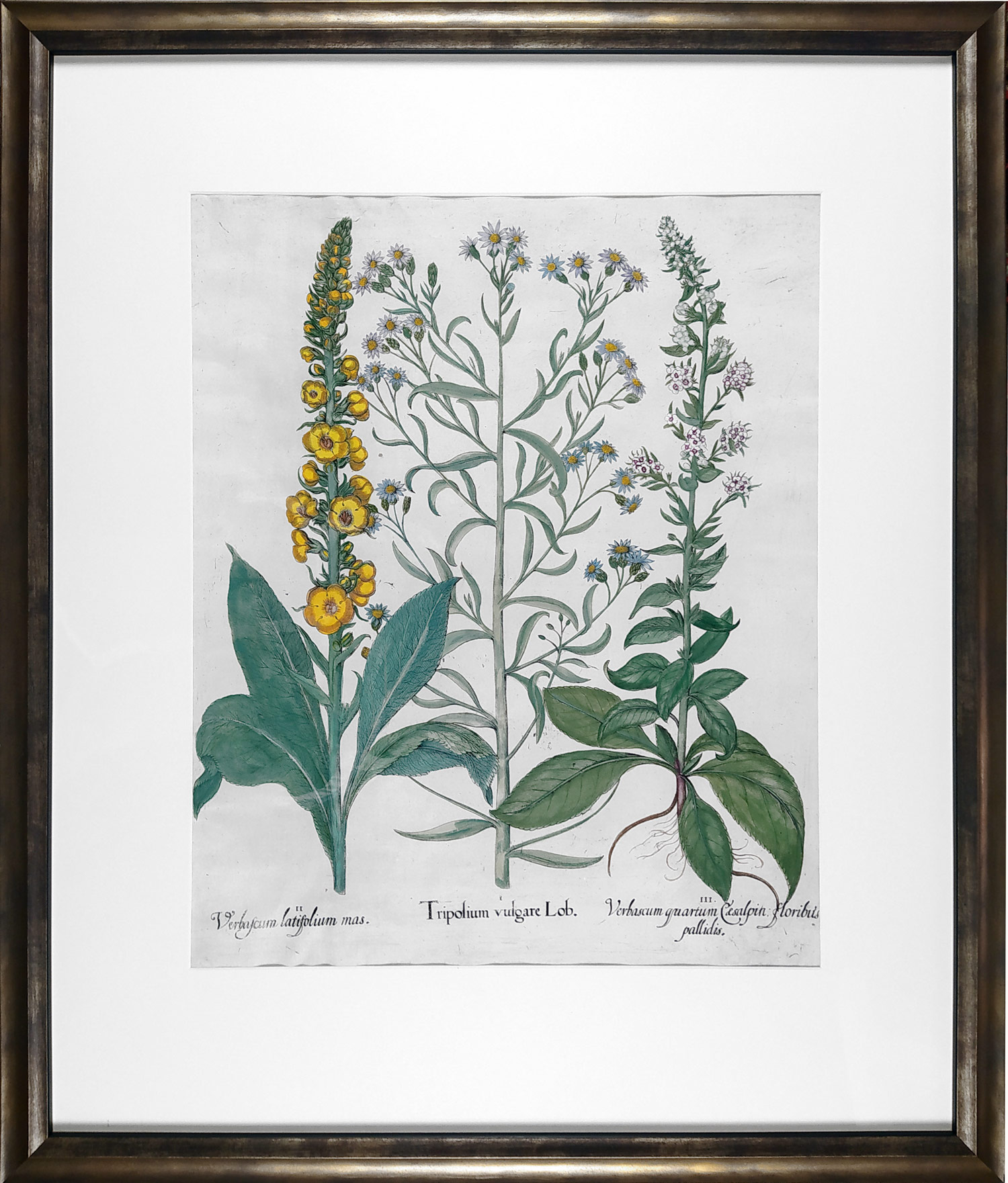 „I. Tripolium vulgare Lob – Hvězdnice slanistá, II. Verbascum latifolium mas – Divizna, III. Verbascum quartum Caesalpin: floribus pallidis – Divizna“. Staře kolorovaný původní mědiryt z B. Beslerova (1561–1629) slavného díla Hortus Eystettensis.