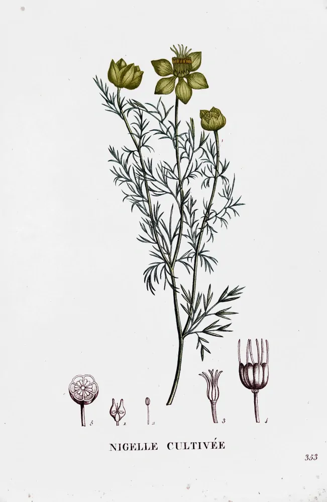 Saint–Hilaire Jaume – Černucha, staře kolorované původní lepty, 1833. Z Jaume Saint–Hilaire: La Flore et la Pomone Françaises, vydáno v Paříži 1833. Celkový rozměr: 26,0 cm × 17,0 cm.