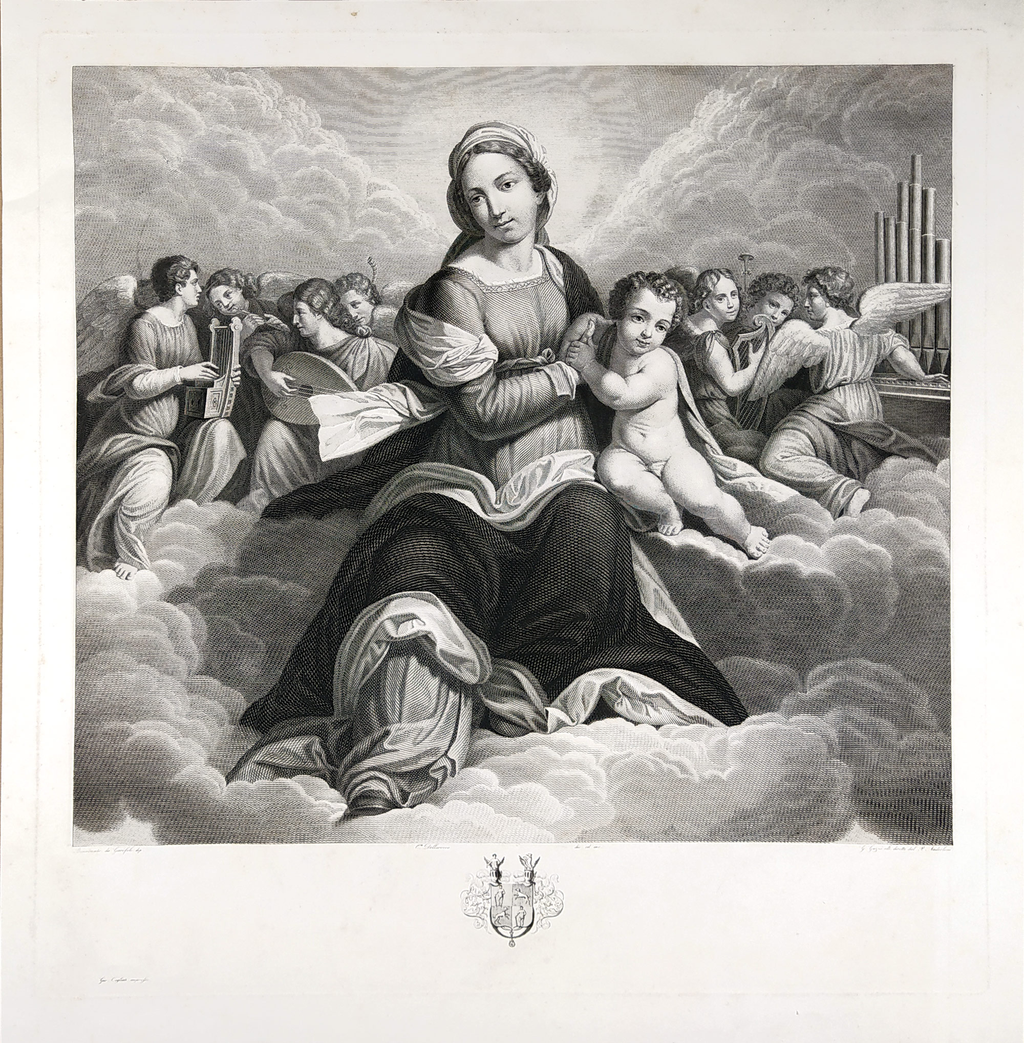 Madona s dítětem ve slávě – Garofalo, Carlo Della Rocca, Pietro Anderloni, Giuseppe Guzzi, původní mědiryt, ca 1843. Celkový rozměr: 51,3 cm × 49,8.