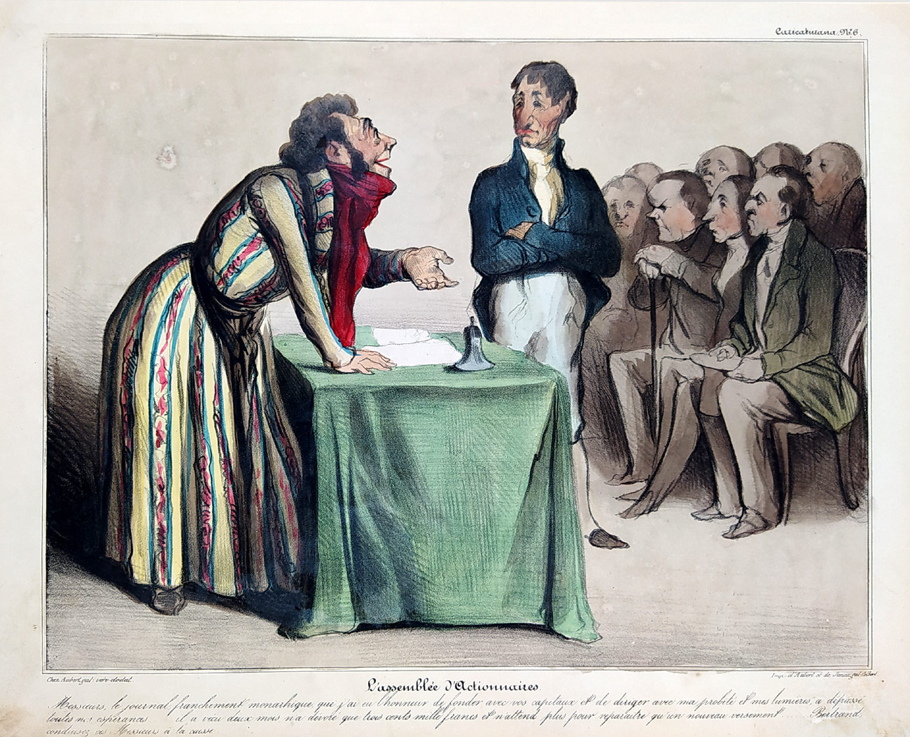 - Daumier Honoré – Valná hromada akcionářů, Caricaturana N° 6, staře kolorovaná litografie, ca 1840