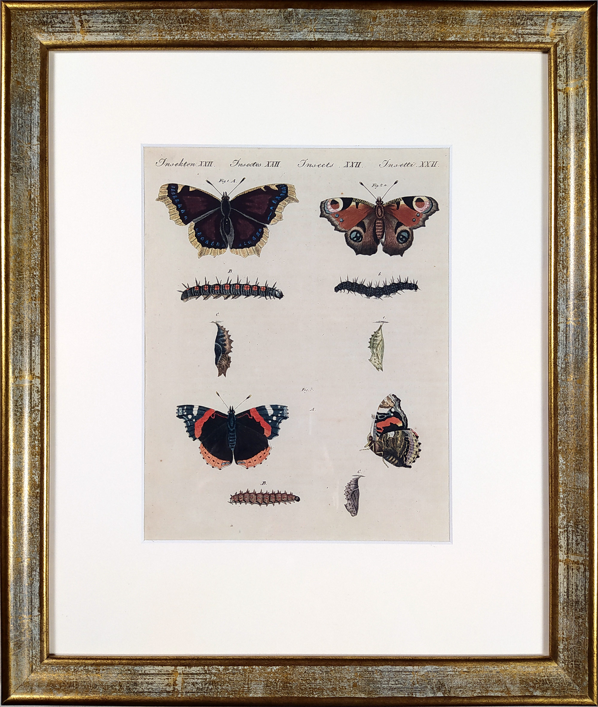Schmuzer Jacob Xaver – Babočka osiková, Babočka paví oko, Babočka admirál, staře kolorovaný původní mědiryt, ca 1760. Celkový rozměr: 38,8 cm × 32,8 cm.