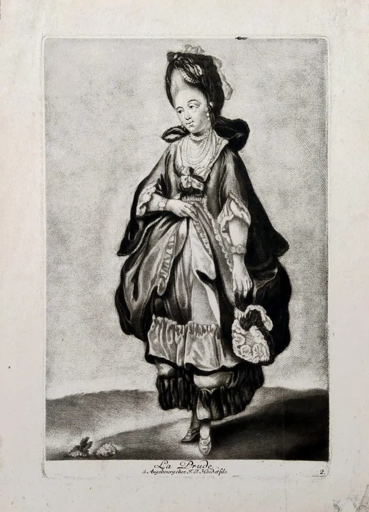 Haid Johann Jakob – La Prude, původní mezzotinta, ca 1740. Signováno typograficky uprostřed dole. Celkový rozměr: 26,5 cm × 19,4 cm.