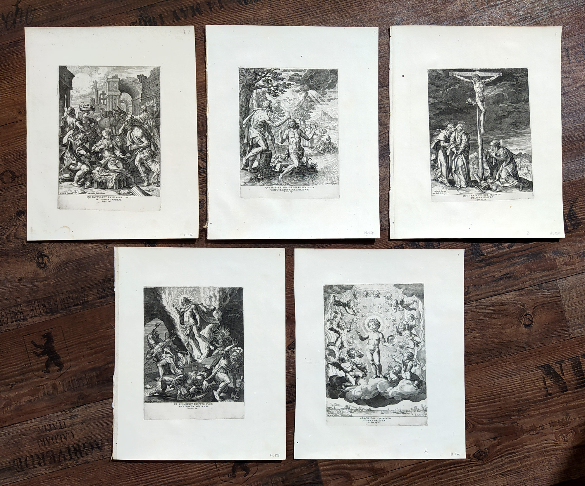 Sadeler Johann – Výjevy ze života Kristova, předloha Marten de Vos, 5 původních mědirytů, 1582. Signováno typograficky pod vyobrazením. Celkový rozměr: á 30,6 cm × 25,0 cm.