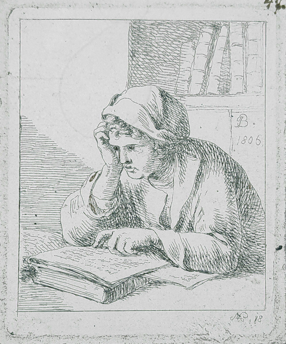 Bergler Josef – Čtenář v knihovně, mědiryt s leptem, 1806. Signováno J. B. v desce s datací. Celkový rozměr: 23,8 cm × 18,0 cm.