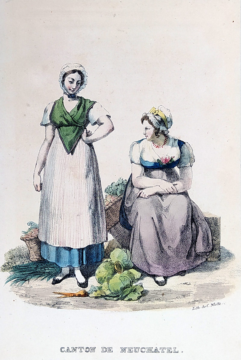 Švýcarsko – Neuchâtel, G. Engelmann, staře kolorovaná původní litografie, 1826. Pod vyobrazením název listu: „Canton du Neuchatel“. Z díla: Costumes suisses anciens et modernes, vydal G. Engelmann v r. 1826. Celkový rozměr: 33,5 × 24,5 cm.