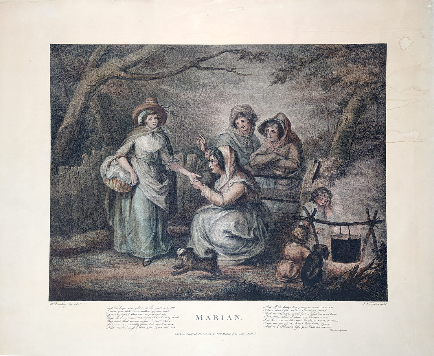 Peltro William Tomkins – Marian, Věštění z ruky, barevný lept, 2. pol. 19. století.