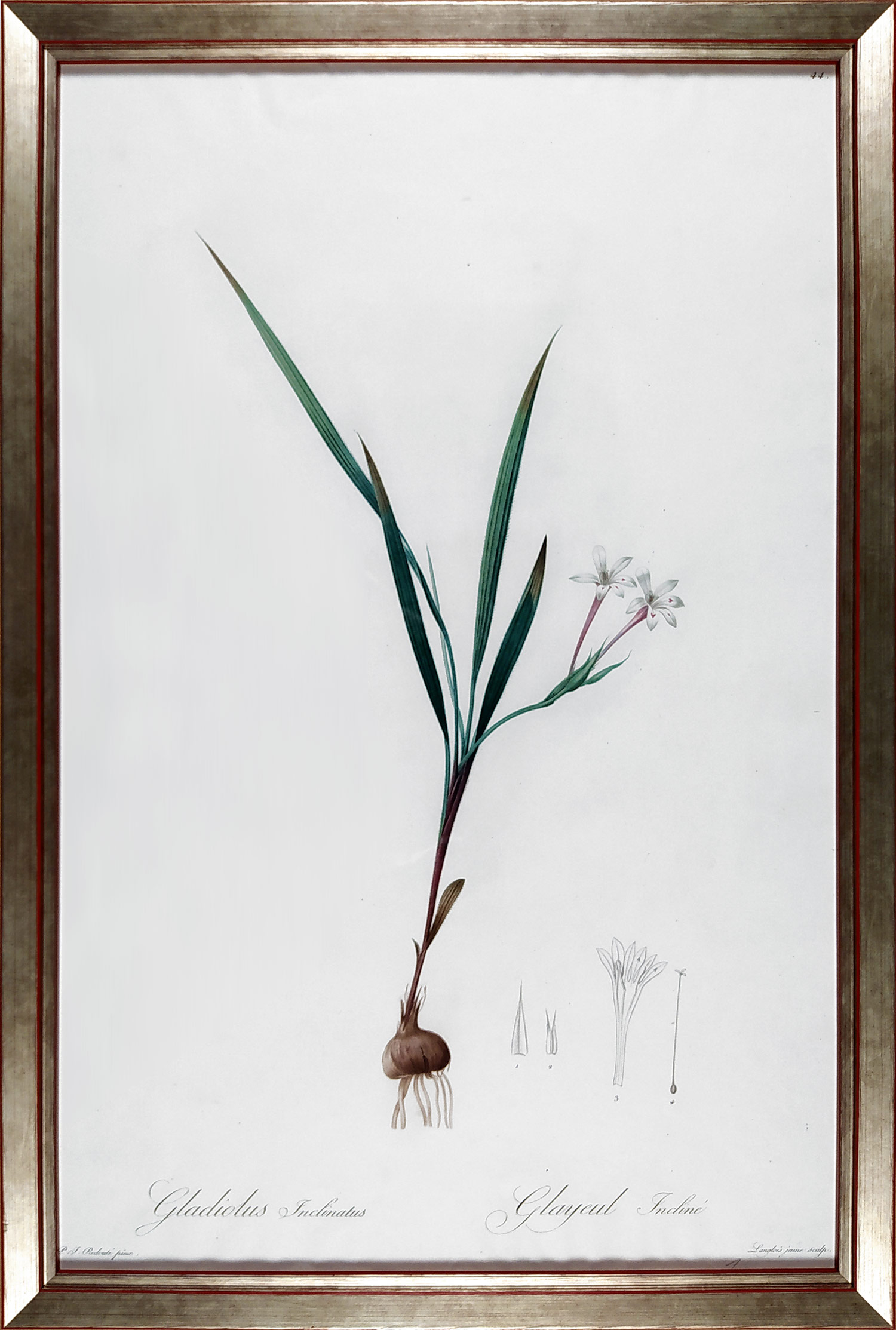 Redouté Pierre Joseph – Eleutherine, staře kolorovaná původní akvatinta, 1808. Pod vyobrazením hlavní název listu: „Gladiolus Inclinatus. Glayeul Incliné.“ Z díla: Les liliacées (1805–1816), monumentální dílo Pierra-Josepha Redoutého, pravděpodobně největšího malíře květin všech dob. Jeho botanické předměty jsou zastoupeny jak s estetickou jemností, tak vědeckou přesností. Vydáno v Paříži (1805–1816).