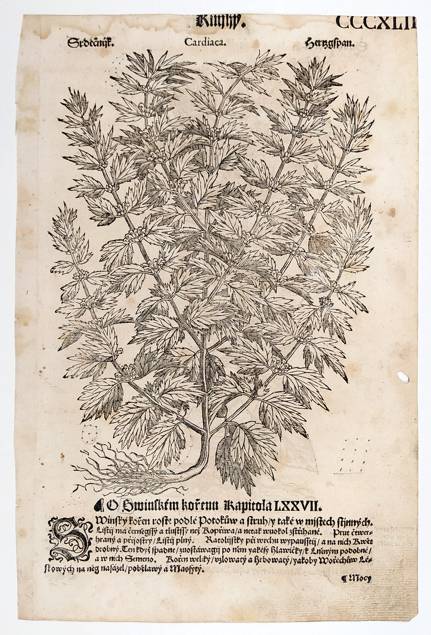 Mattioli Pietro Andrea – Srdečník obecný, Krtičník hlíznatý, původní dřevořez, 1562. List CCCXLII, Srdečník. Cardiaca. / Swinský kořen. Scrophularia.