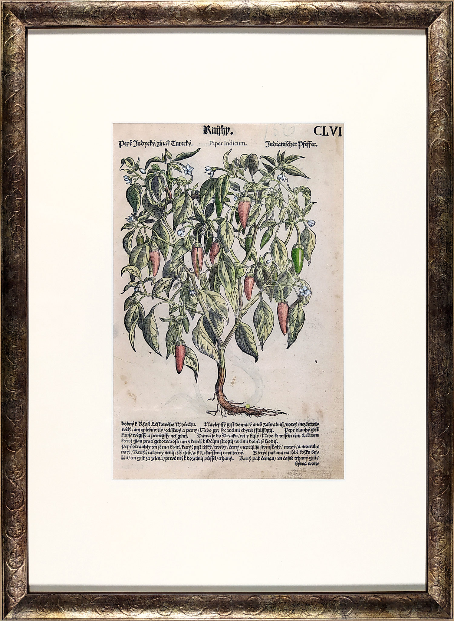 - Mattioli Pietro Andrea – Chilli paprička, staře kolorovaný původní dřevořez, 1562
