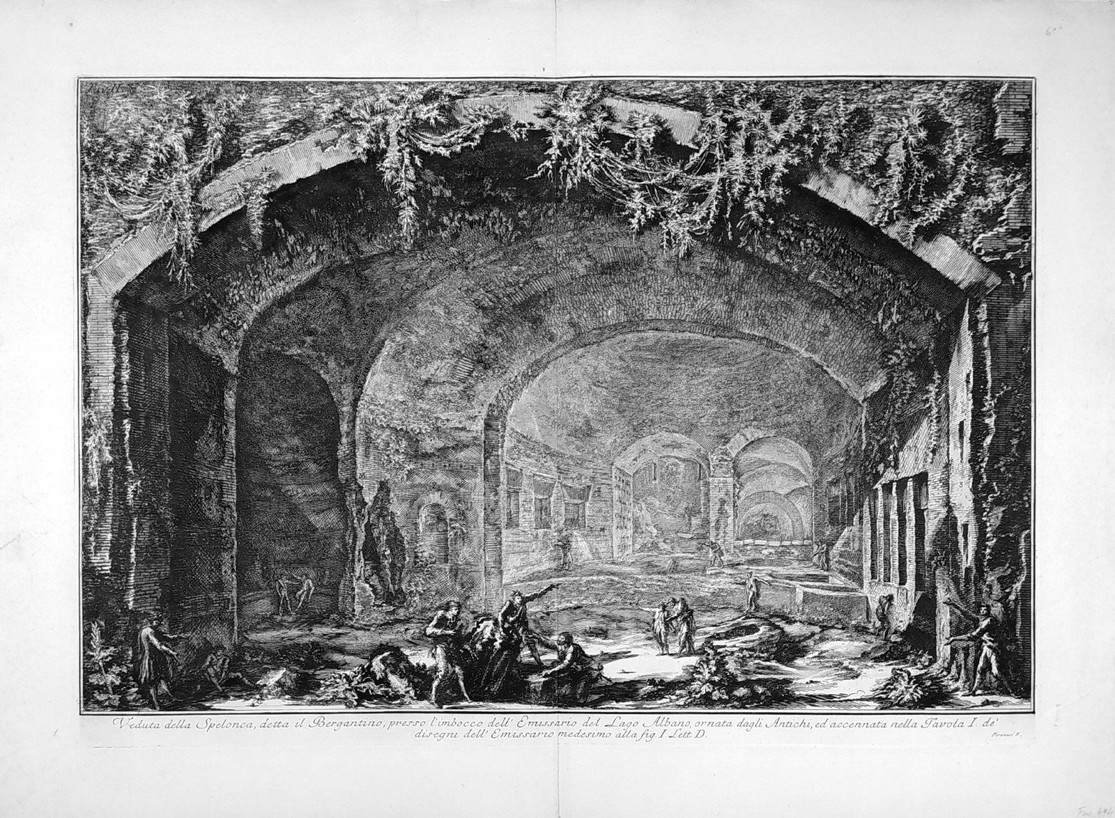 Piranesi, Giovanni Battista – Itálie, Lazio, Lago di Albano, původní lept, 1762. Pod vyobrazením název listu: „Veduta della Spelonca, detta il Bergantino, presso l´imbocco dell´Emissario del Lago Albano, ornata dagli Antichi, ed accennata nella Tavola I. dé disegni dell´Emissario medesimo alla fig. I. Lett. D.“. Z díla: Antichita d'Albano e di Castel Gandolfo, vydáno v Římě r. 1762.