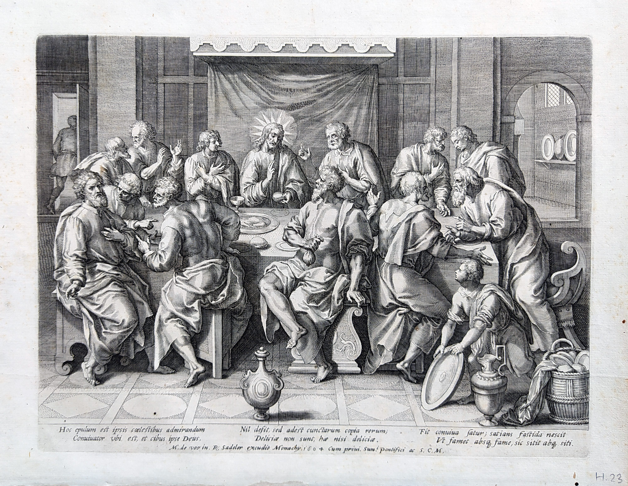 Sadeler Rafael I. – Poslední večeře, předloha Marten de Vos, původní mědiryt, 1604. Signováno typograficky pod vyobrazením. Celkový rozměr: 24,7 cm × 30,6 cm.