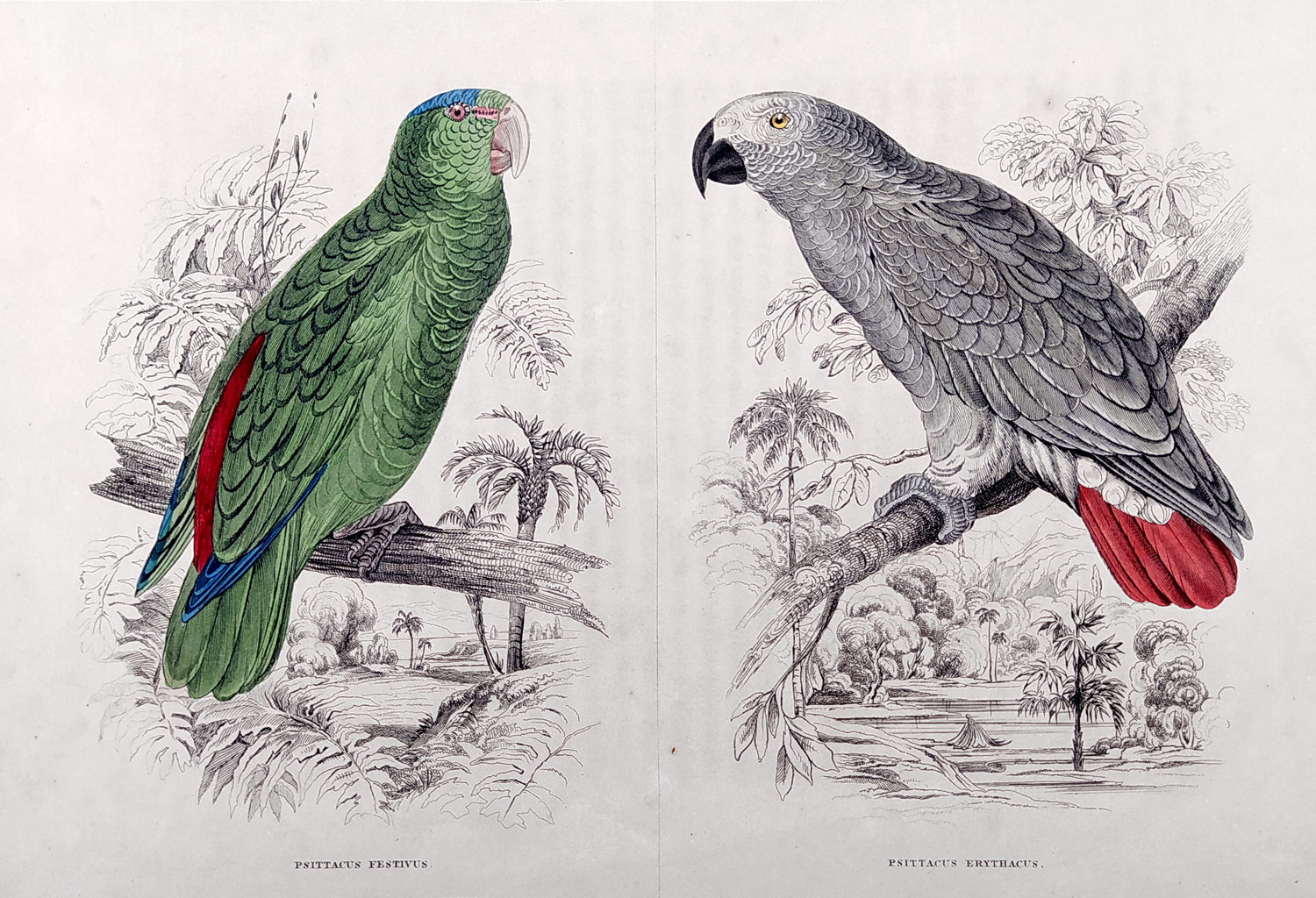 Seipp A. – Amazoňan modrobradý, Žako šedý, kolorovaná litografie, ca 1860