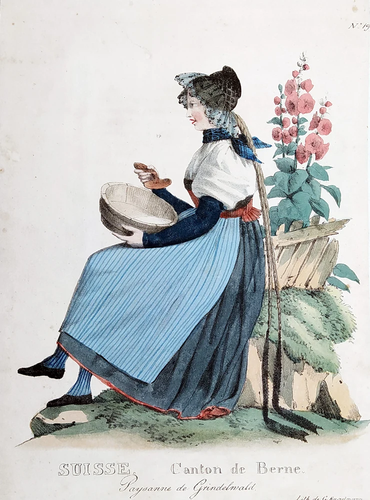 Švýcarsko – Bern, Grindelwald, G. Engelmann, staře kolor. litografie, 1826. Pod vyobrazením název listu: „Suisse, Canton de Berne. Paysanne de Grindelwald“.