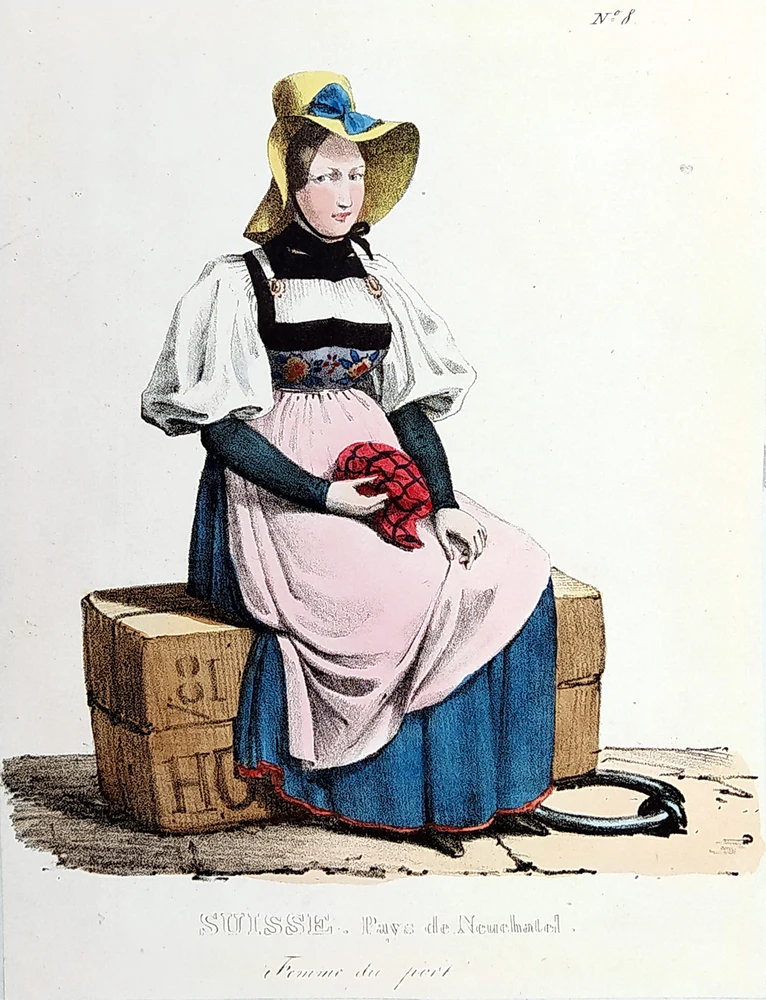 Švýcarsko – Neuchâtel, G. Engelmann, staře kolor. litografie, 1826. Pod vyobrazením název listu: „Suisse, Paus de Neuchatel. Femme du fiert“.