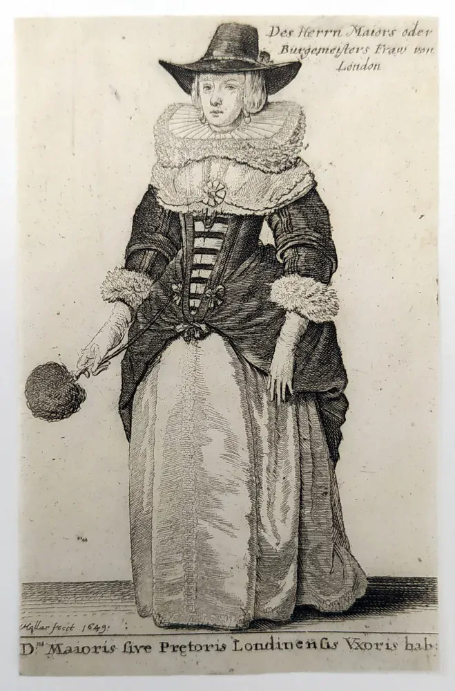 Hollar Václav – Manželka starosty Londýna, Parthey 1812i, původní lept, 1649. Dni: Maioris sive Pretoris Londiensis Uxoris hab. Des Herrn Maiors oder Bürgermeisters Frau von London.. Celkový rozměr: 9,3 × 5,7 cm.