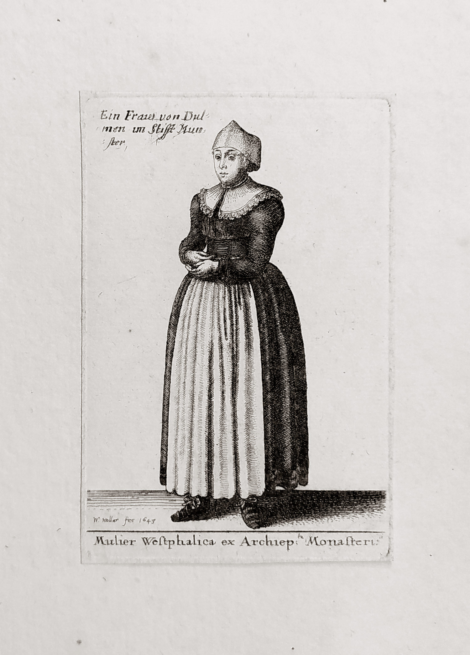 Hollar Václav – Mulier Westphalica ex Archiep: Monasteri, Parthey 1816 i/ii, původní lept, 1643. Podle vlastní kresby leptal V. Hollar, 1649. Ze souboru: Theatrum Mulierum. Rozměr tiskové plochy: 9,4 × 6,2 cm.