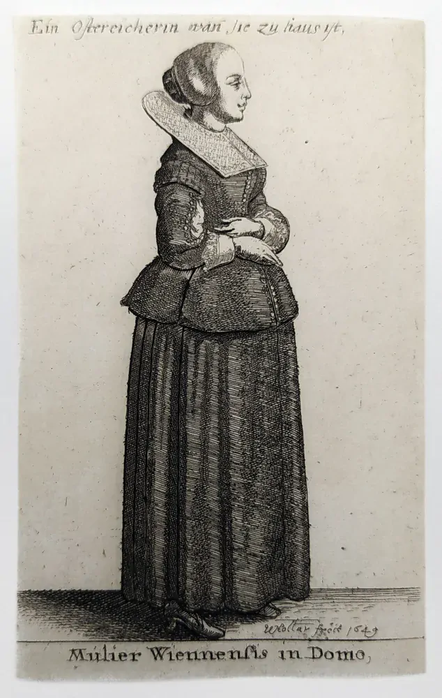 Hollar Václav – Vídeňačka v domácím oděvu, Parthey 1815, původní lept, 1649. Název listu: Mulier Wiennensis in Domo. Ein Ostereicherin wan sie zu Haus ist. Podle vlastní kresby leptal Václav Hollar. Celkový rozměr: 9,2 × 5,6 cm.