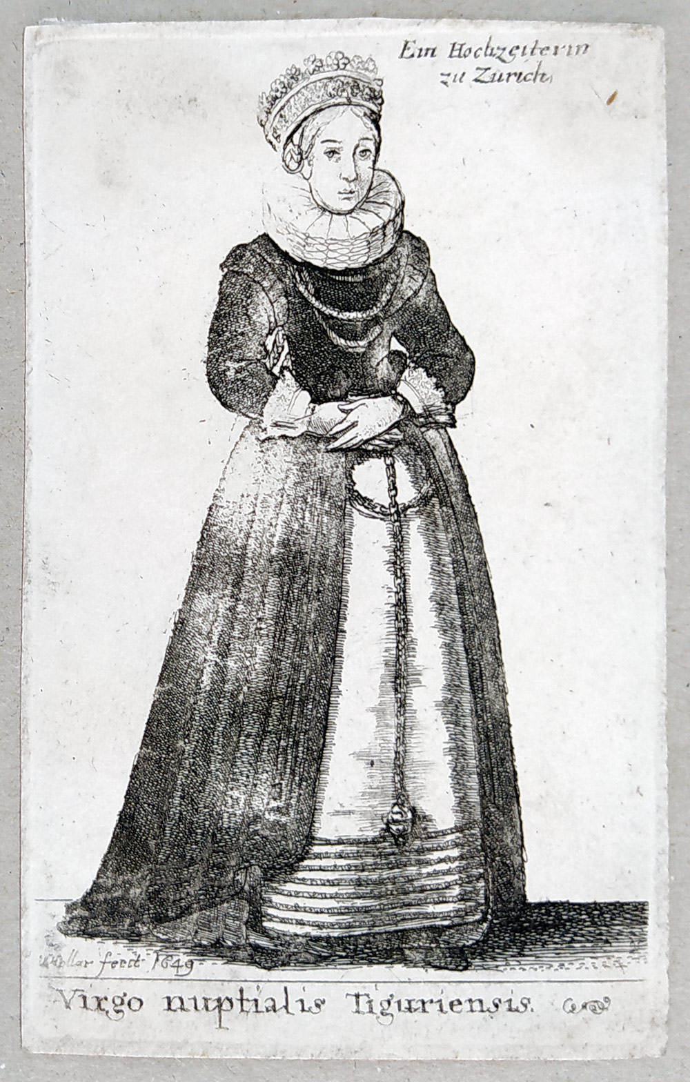 Hollar Václav – Virgo nuptialis Tiguriensis. Ein Hochzeiterin zu Zurich, Parthey 1864, původní lept 1649. Podle vlastní kresby leptal V. Hollar, 1649. Ze souboru: Theatrum Mulierum. Rozměr tiskové plochy: 9,2 × 5,5 cm.