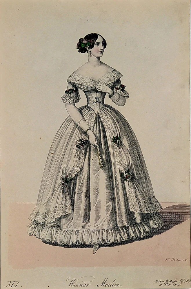 Vídeňská dámská móda – Wiener Moden XLI., Fr. X. Stöber, původní kolorovaný oceloryt, 1840.