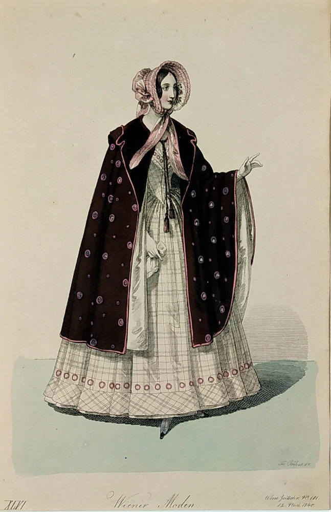 Vídeňská dámská móda – Wiener Moden XLVI., Fr. X. Stöber, původní kolorovaný oceloryt, 1840. Celkový rozměr v paspartě: 34,0 cm × 25,3 cm.