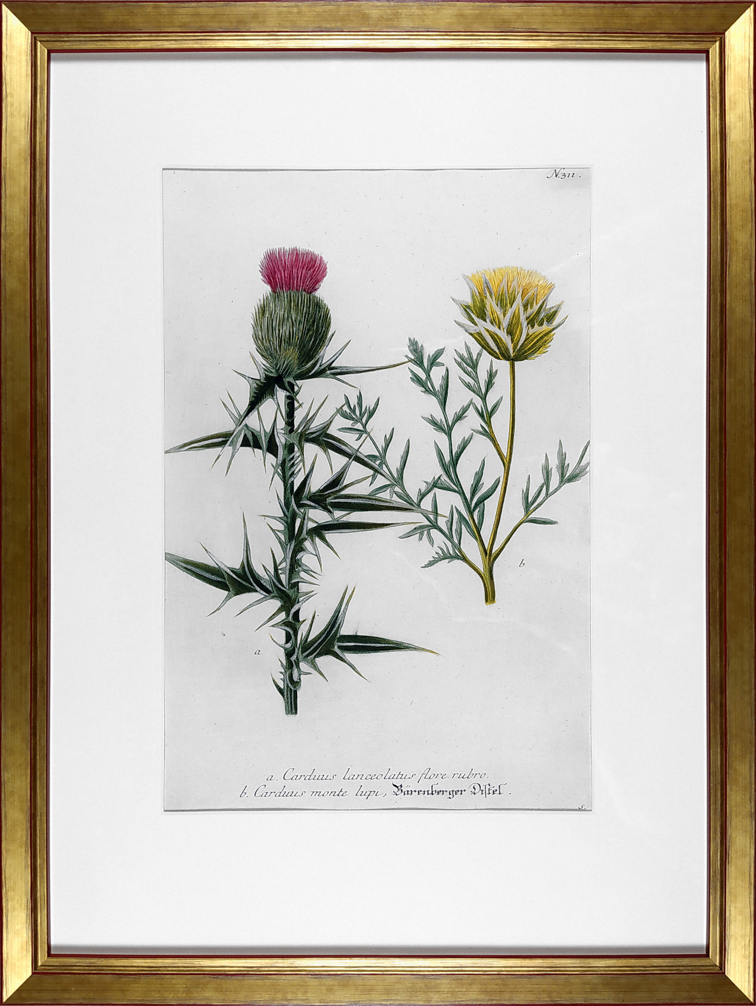 Weinmann, Johann Guilielm – Bodlák, staře kolorovaná původní mezzotinta, 1734–1745. Pod vyobrazením hlavní název listu: „a. Carduus Lanceolatus flore rubro. b. Carduus monte lupi.“