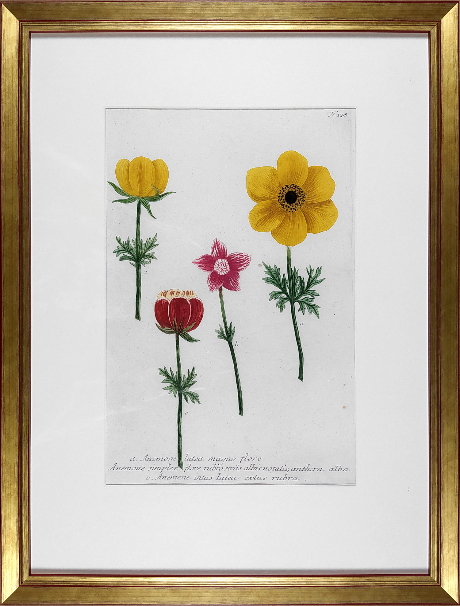 Weinmann, Johann Guilielm – Sasanky, staře kolorovaná původní mezzotinta, 1734–1745. Pod vyobrazením hlavní název listu: „a. Anemone lutea magno flore. b. Anemone simplex flore rubro strüs albis notatis, anthera alba. c. Anemone intus lutea extus rubra.“