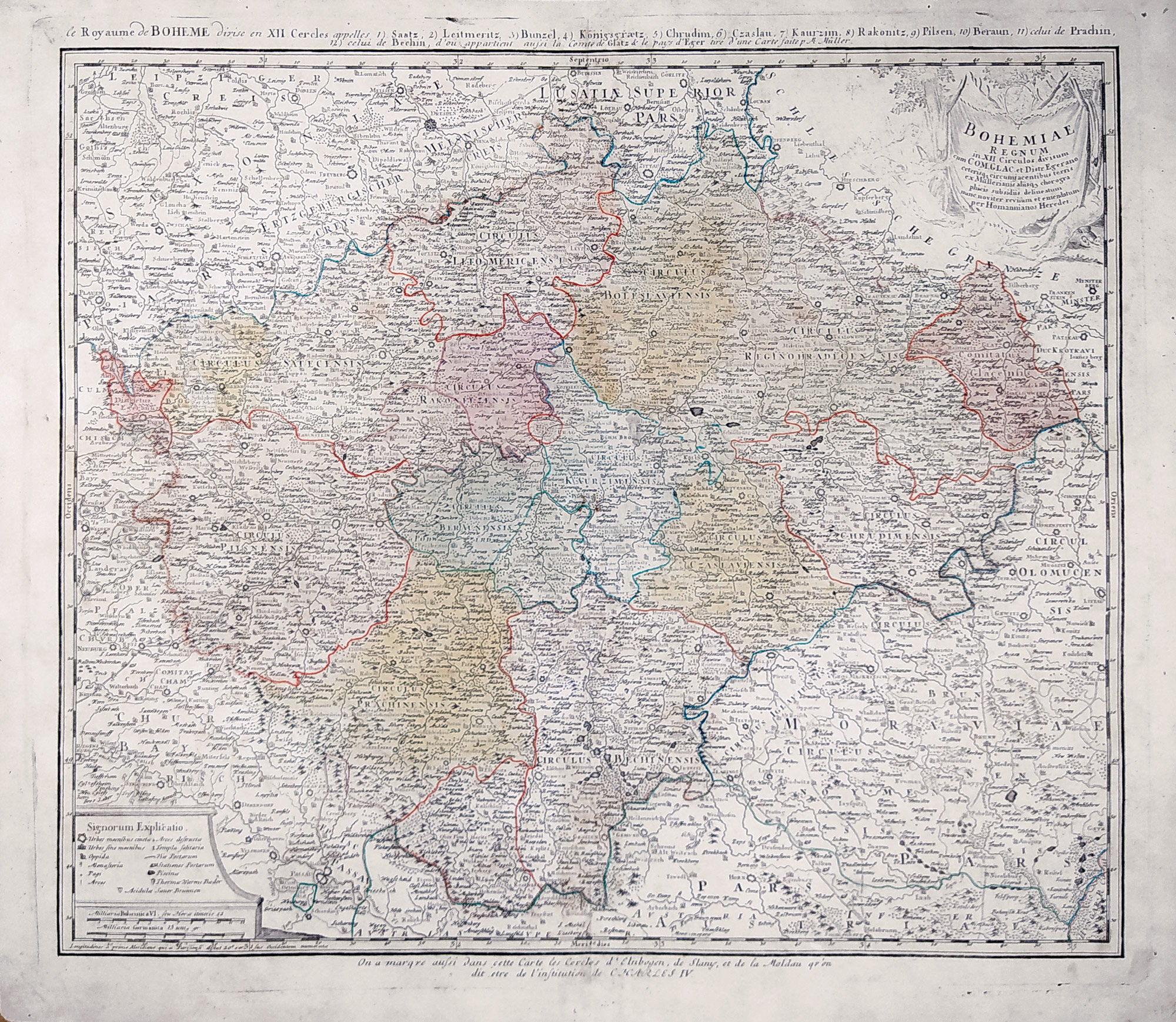 Mapa Čech – Mapa království Českého, Homannovi dědicové, staře kolorovaný původní mědiryt, ca 1740. „Bohemiae Regnum in XII Circulos divisum“. Původní, staře kolorovaný mědiryt podle J. Ch. Müllerovy mapy Čech. Vydali Homannovi dědicové v Norimberku, ca. 1740. Signováno v kartuši. Celkový rozměr: 53,8 cm × 61,7 cm.