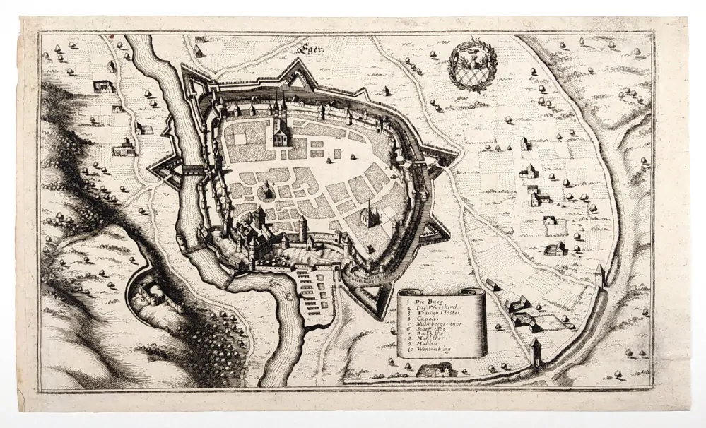 Cheb – opevnění města z ptačí perspektivy, M. Merian, původní mědiryt, 1650. V horní části německý název „Eger“ a erbem, dole popisy jednotlivých objektů 1.-10. Vydal M. Merian ve Frankfurtu nad Mohanem r. 1650. Celkový rozměr listu: 21,0 cm × 35,7 cm.