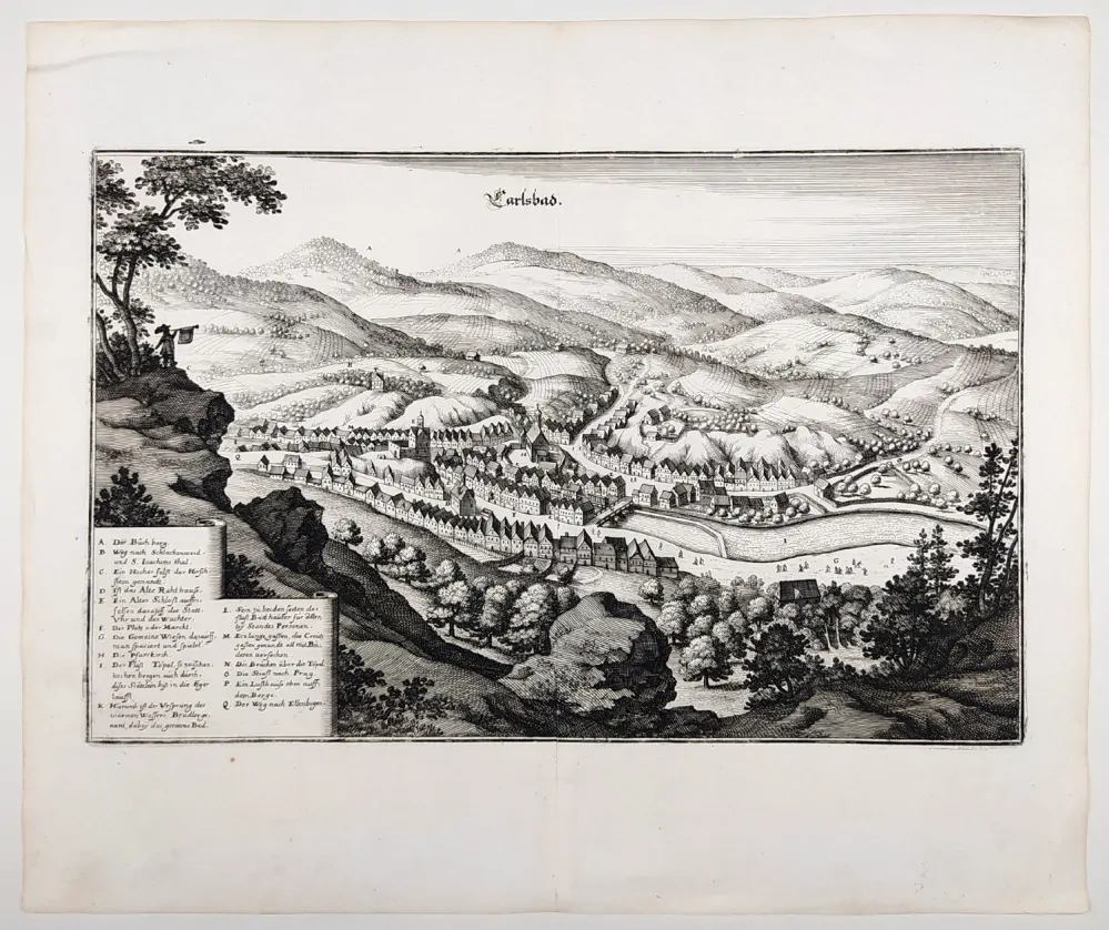Karlovy Vary – celkový pohled na město, M. Merian, původní mědiryt, 1650. V horní části německý název „Carlsbad“, v dolní kartuši popisy jednotlivých objektů A.-Q. Vydal M. Merian ve Frankfurtu nad Mohanem r. 1650. Celkový rozměr listu: 31,0 cm × 36,8 cm.