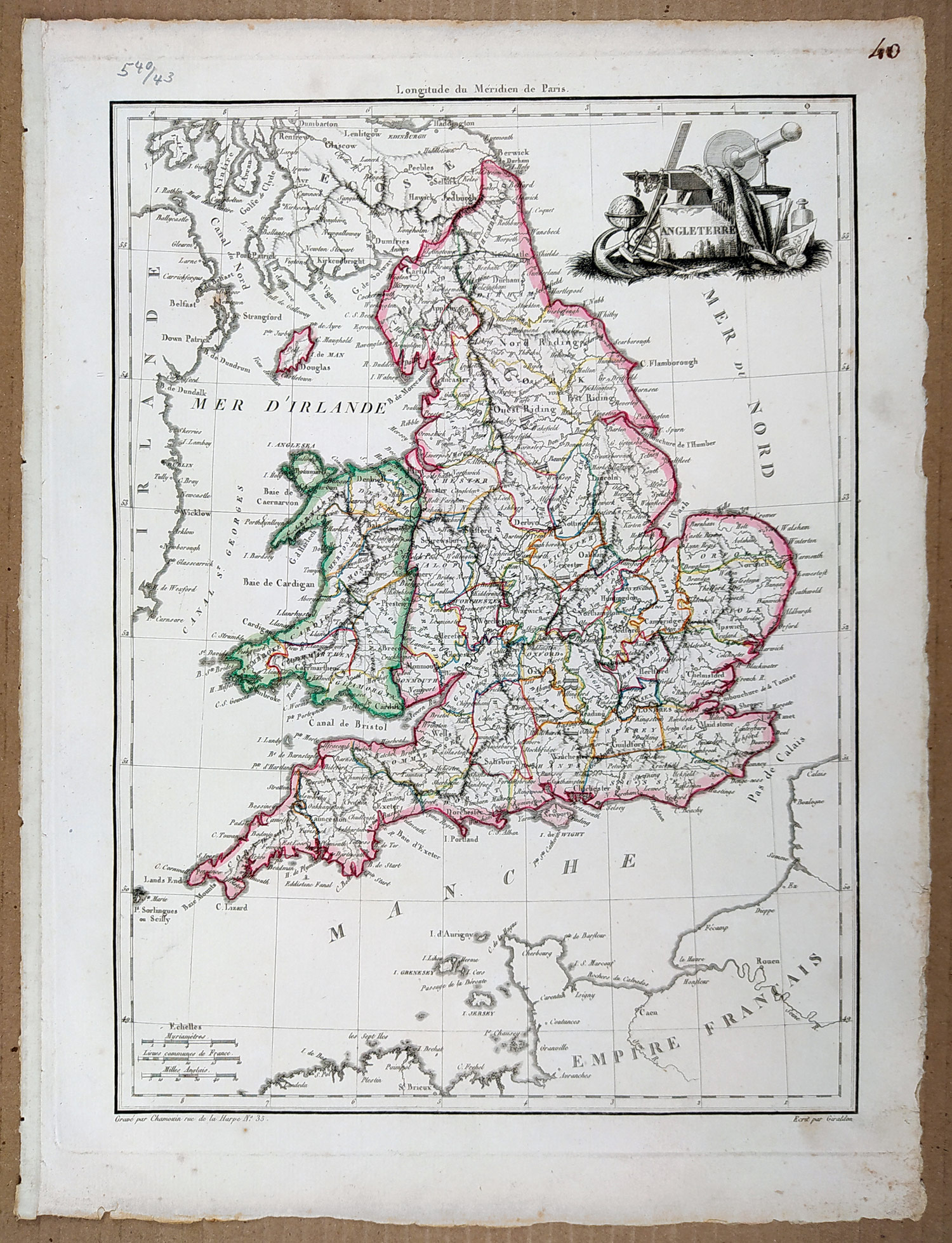Velká Británie – P. J. B. Poirson, staře kolorovaný původní mědiryt, 1809. Název mapy v dekorativní kartuši: „Angleterre“. Celkový rozměr: 35,6 cm × 26,6 cm.