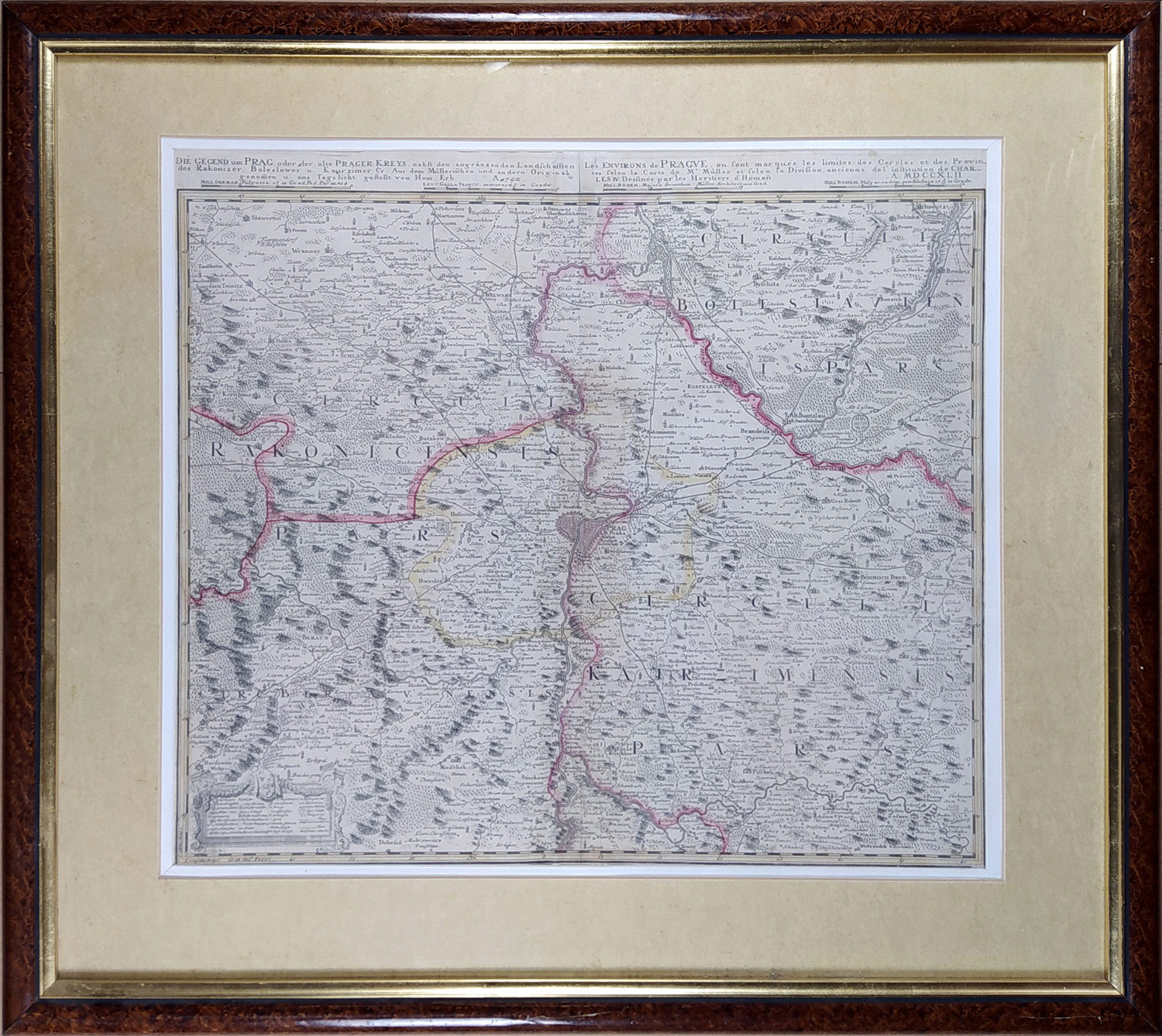 Homannovi dědicové; Plán Prahy a okolí „GEGEND um PRAG, oder der PRAGER Kreys, nebst den angranzen Landschafften Rakonizer, Boleslawer u. Kaurzimer Cr. Aus dem Müllerischen und andern Original genomen u. Ans Tagslicht destellt