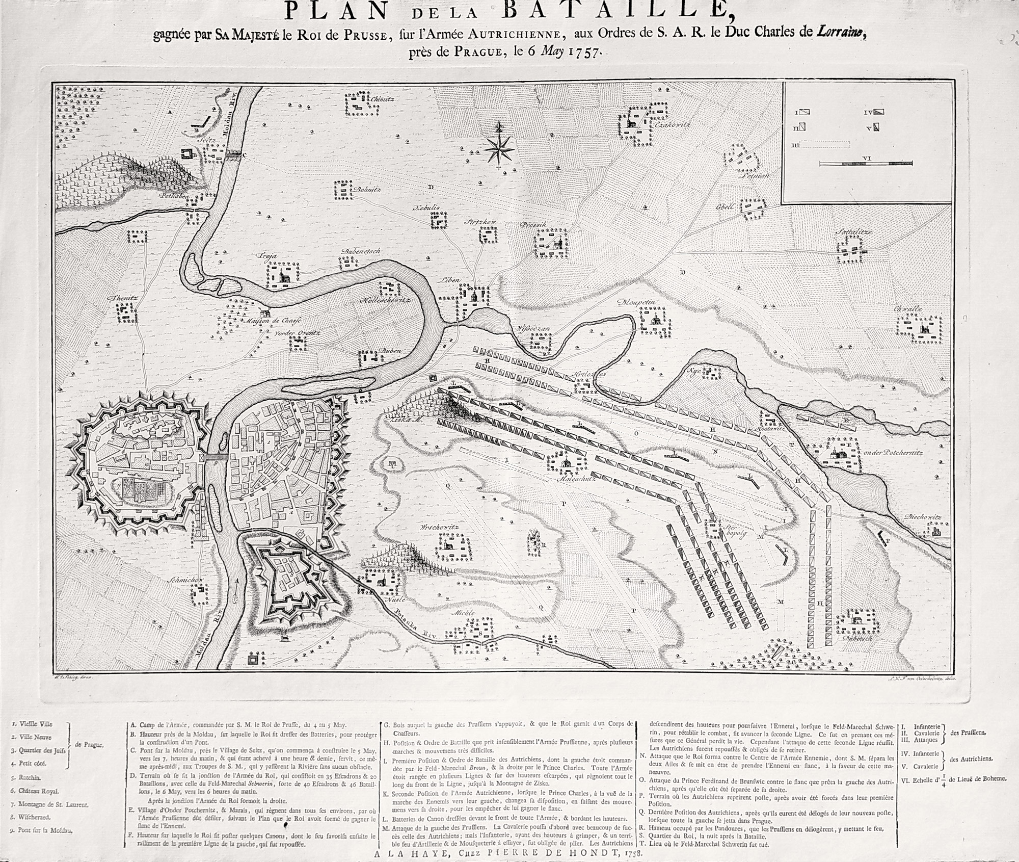 „Plan de la Bataille, gagnée par Sa Majesté le Roi de Prusse, sur l'Armée Autrichienne, aux Ordres de S. A. R. le Duc Charles de Lorraine, près de Prague, le 6 May 1757“.
