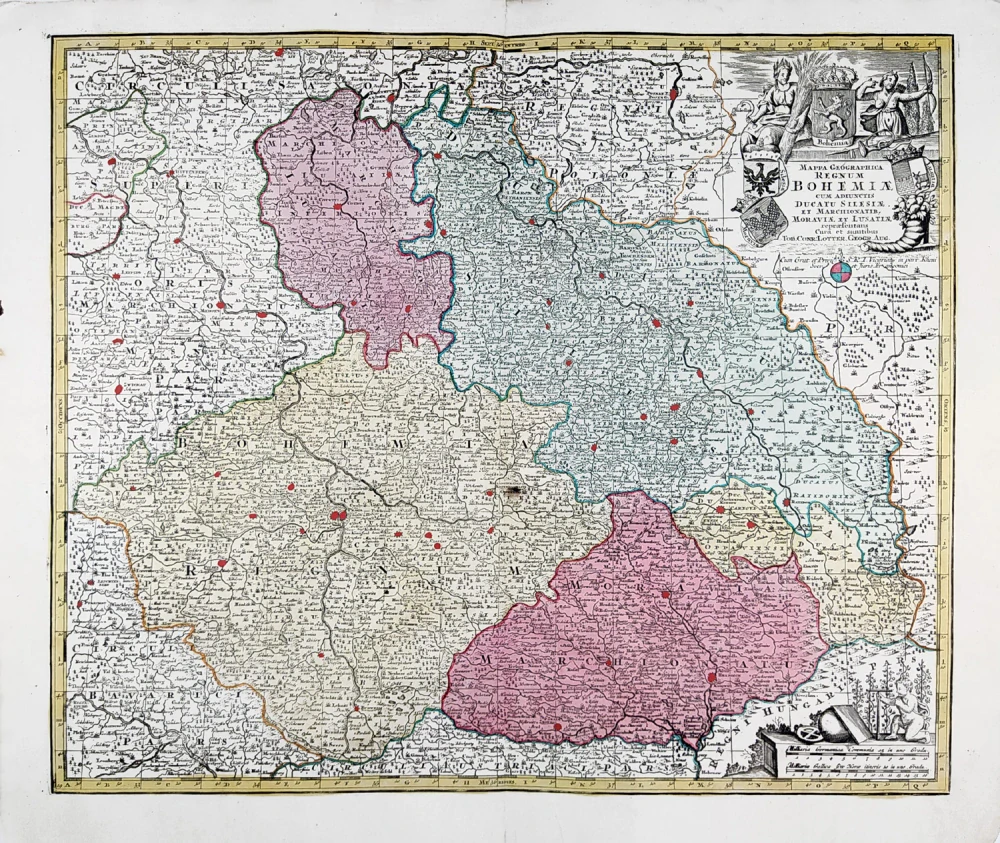 Země Koruny české – Čechy, Morava, Slezsko a Lužice „Mappa Geographica Regnum Bohemiae cum Adiuntis Ducatu Silesiae, et Marchionatib. Moraviae et Lusatiae repraesentans.“ Staře kolorovaný původní mědiryt. Vydal Matthäus Seutter v Augsburku ca 1740. Mapa s figurální titulní kartuší a se čtyřmi erby.