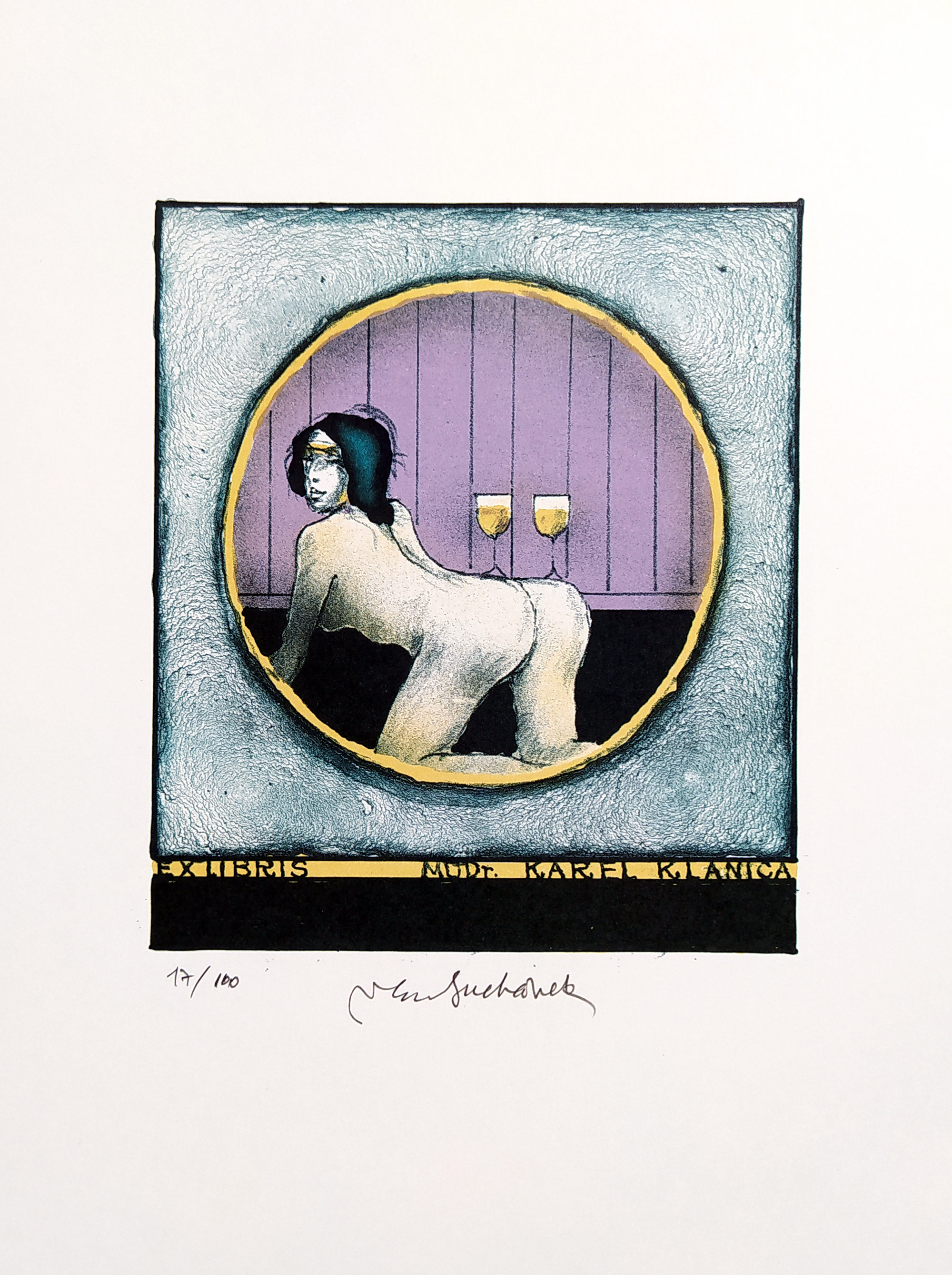 Vladimír Suchánek – Ex libris MUDr. Karel Klanica, původní barevná litografie, č. 17/100, nedatováno. Signováno tužkou uprostřed dole. Celkový rozměr: 19,9 cm × 14,9 cm.