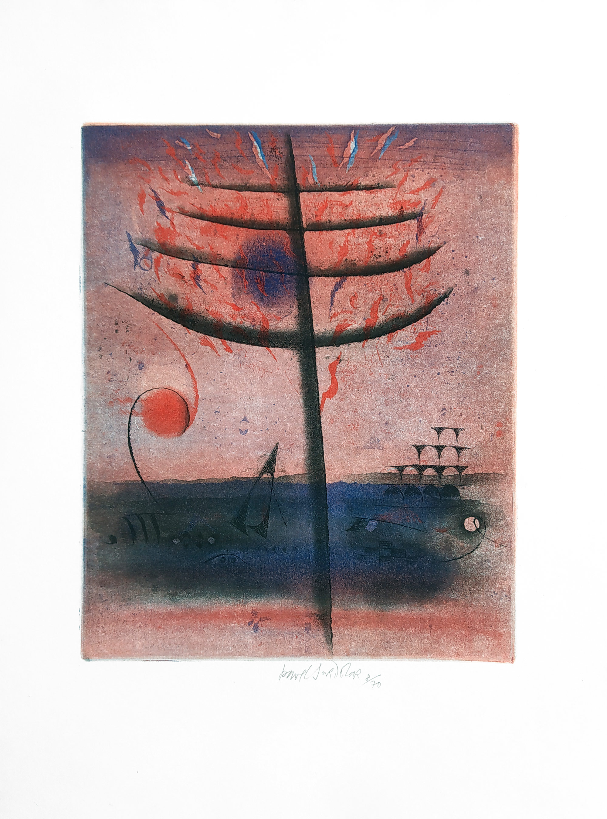 Pavel Sukdolák – Oheň, cyklus Živly, barevný lept a akvatinta, č. 8/70, nedatováno. Signováno tužkou uprostřed dole. Celkový rozměr: 42,8 cm × 31,8 cm.