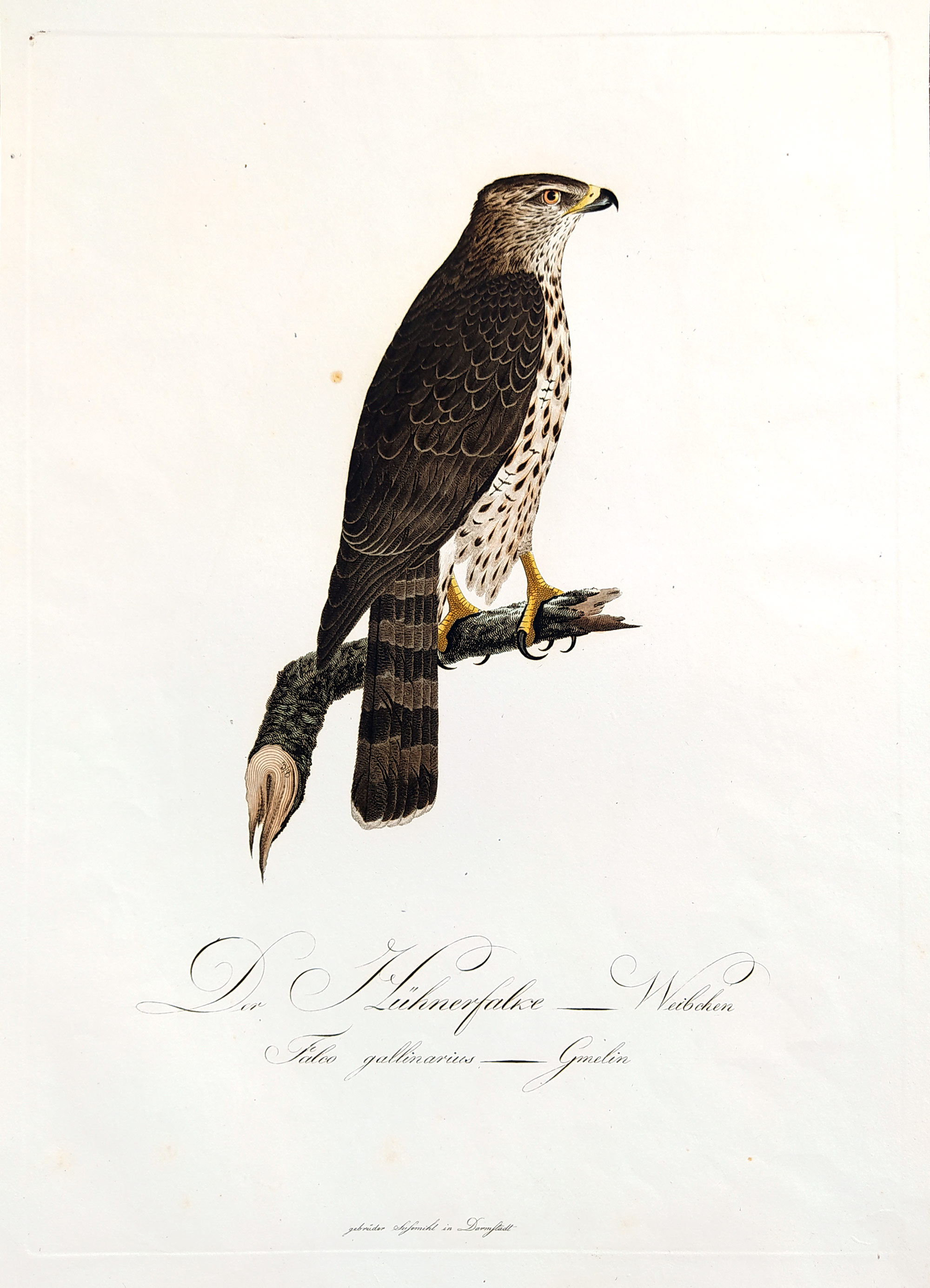 Susemihl J. C. – Jestřáb obecný, Falco gallinarius, staře kolorovaný původní lept, 1805