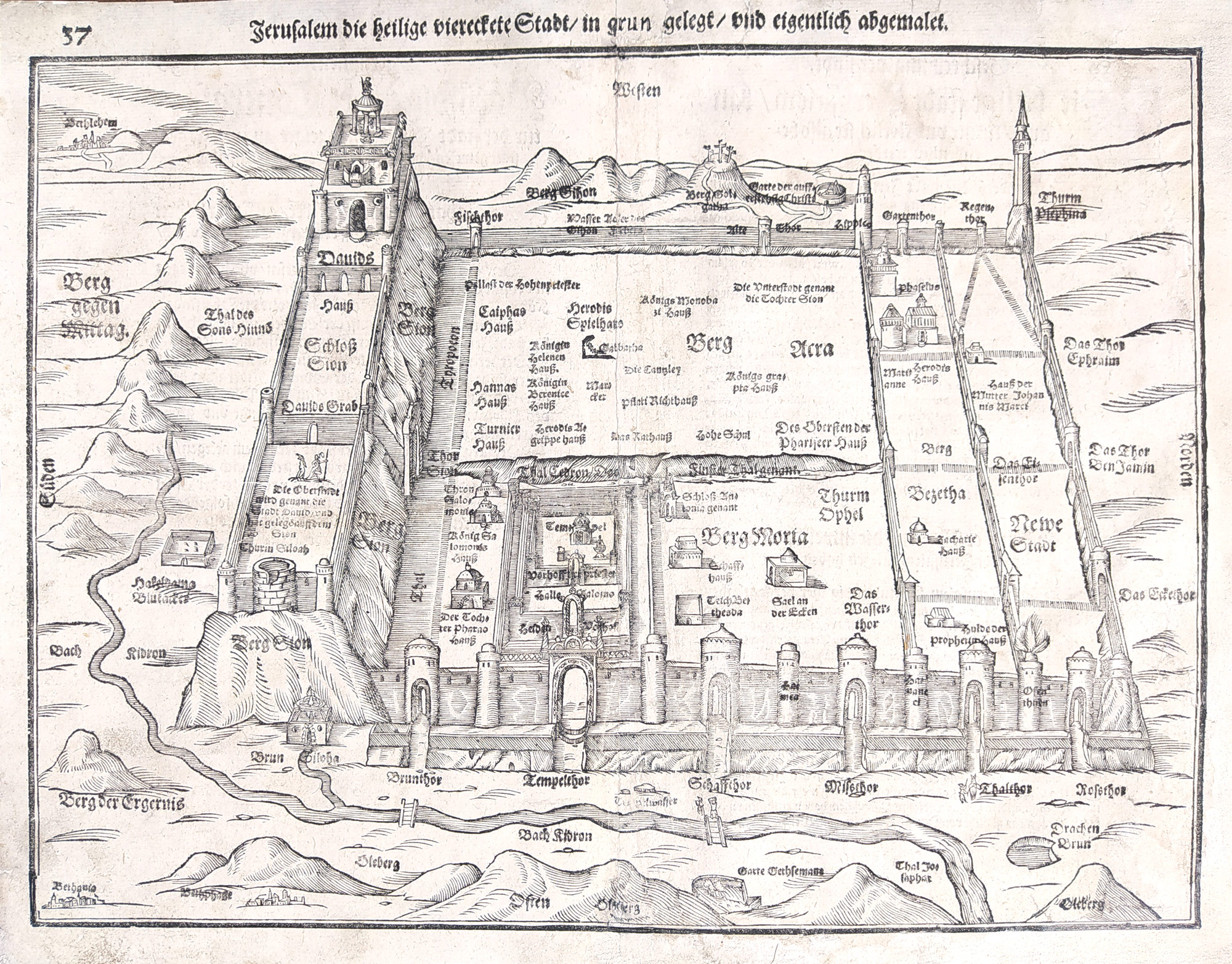 Svatá země – Jerusalem die heilige vierecete Stadt, Heinrich Bünting, původní dřevořez, Basilej, 1600. Dvoustránková mapa, na rubu německý text, Magdeburg, 1600. Z Dunckerova vydání Itinerarium Sacrae Scripturae z roku 1600, identifikovaného stránkováním v horních rozích (strany 37 a 38). Celkový rozměr: 30,3 cm × 38,6 cm.