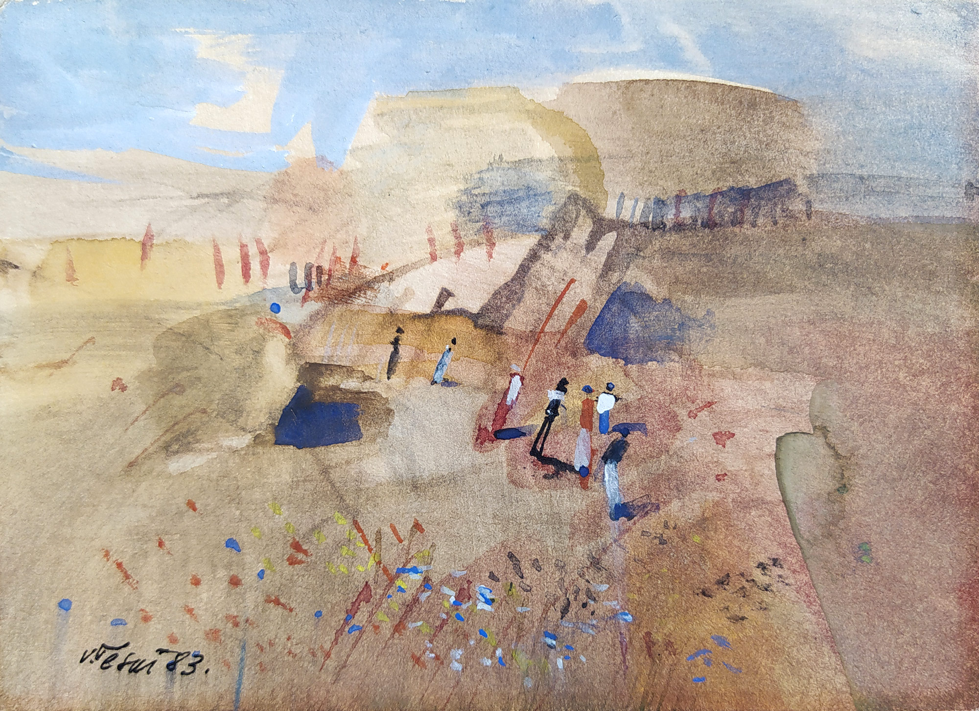 Tesař Vladimír – Figury v krajině, malba akvarelem, použito jako odeslaná pohlednice, 1983.