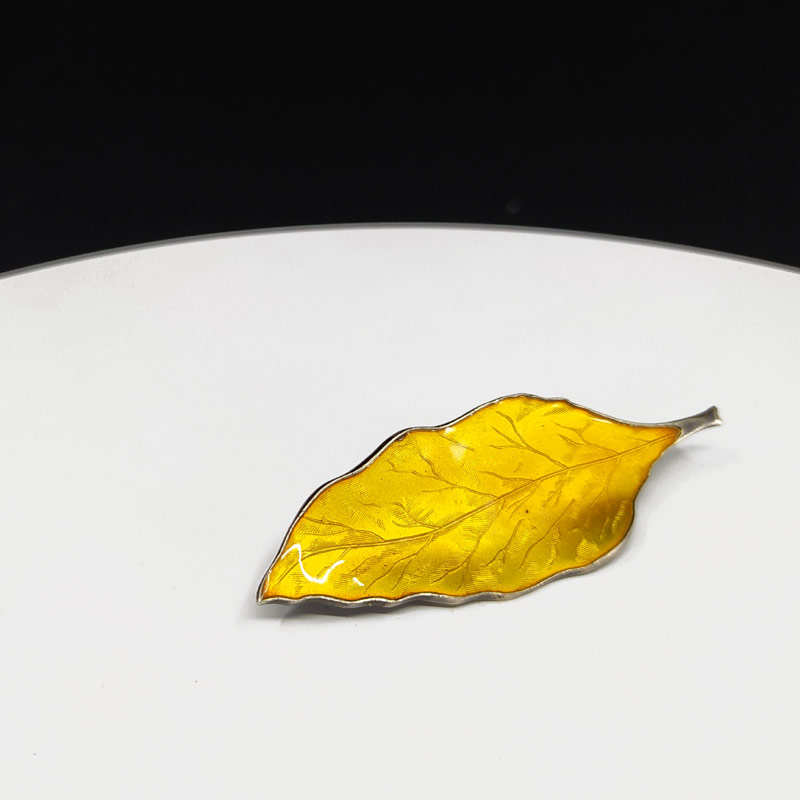 Stříbrná brož ve tvaru lístků zdobená žlutým emailem, se zbytky zlacení. Šperkařská firma Brødrene Bjørklund, Dánsko.