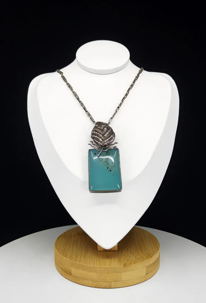 Kinetický stříbrný přívěsek s achátem s rostlinným motivem na řetízku.