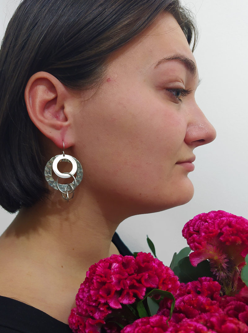 Stříbrné náušnice s kruhovými ověsky, kombinace hladkého a tepaného dekoru, původ: Mexiko.