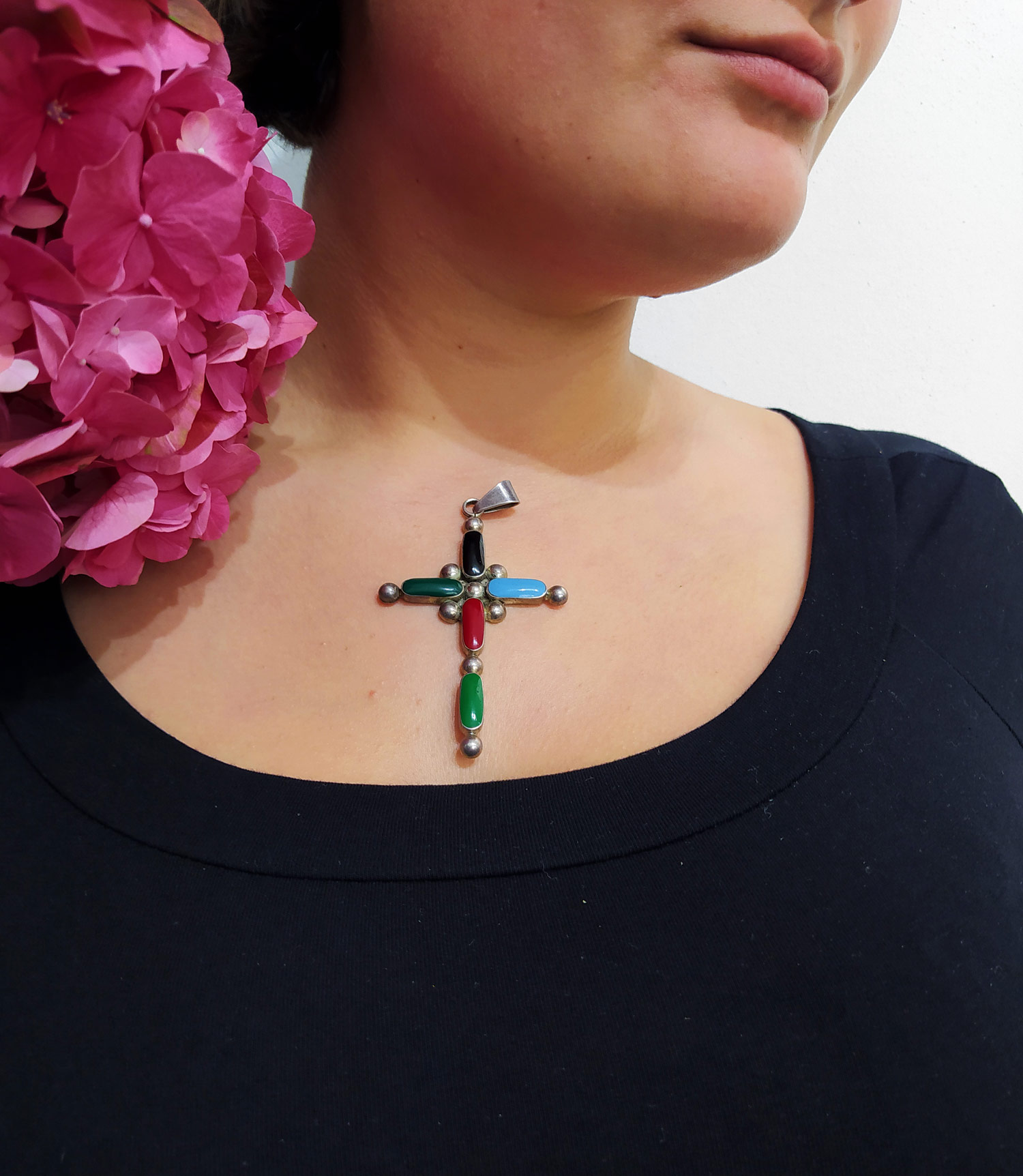 Stříbrný závěs ve tvaru kříže s drahými kameny z mexického města Taxco, proslulého šperkařskou tradicí.