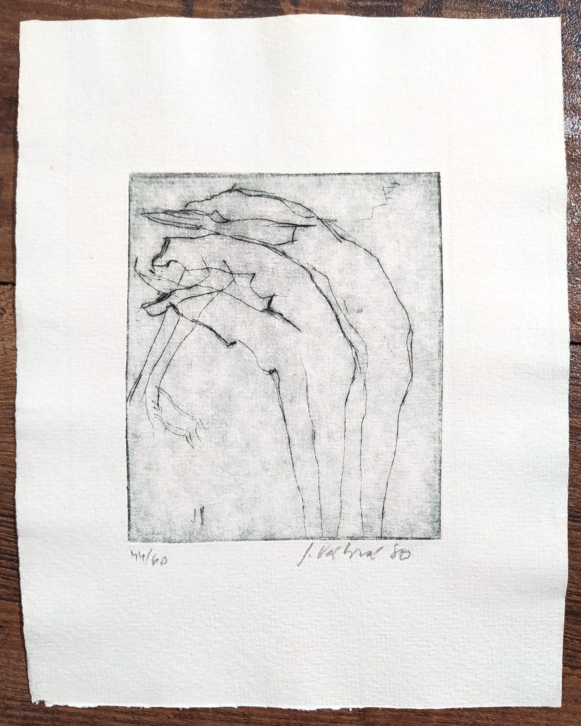 Jitka Válová – Figury v pohybu, původní suchá jehla, číslováno 44/60, 1980. Signováno tužkou vpravo dole s datací. Celkový rozměr: 19,1 cm × 14,7 cm.