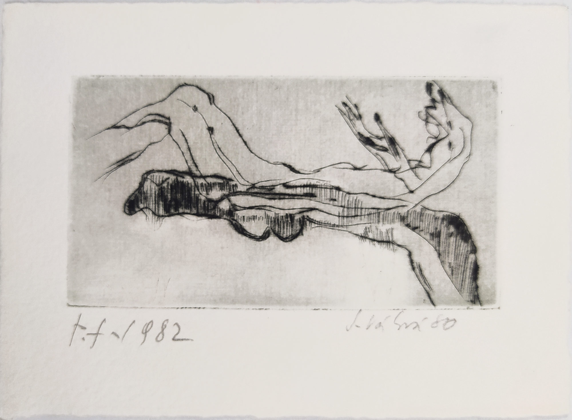 Válová Jitka – Figury v pohybu, původní suchá jehla, použito jako PF 1982, 1980. Signováno tužkou vpravo dole s datací. Vytiskl Ing. Zdeněk Šíma. Celkový rozměr: 10,4 cm × 14,8 cm.