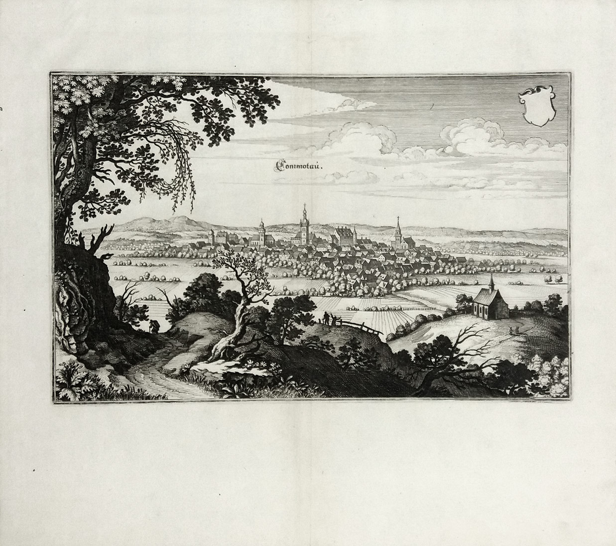 - Chomutov – pohled na město, M. Merian, původní mědiryt, veduta, 1650